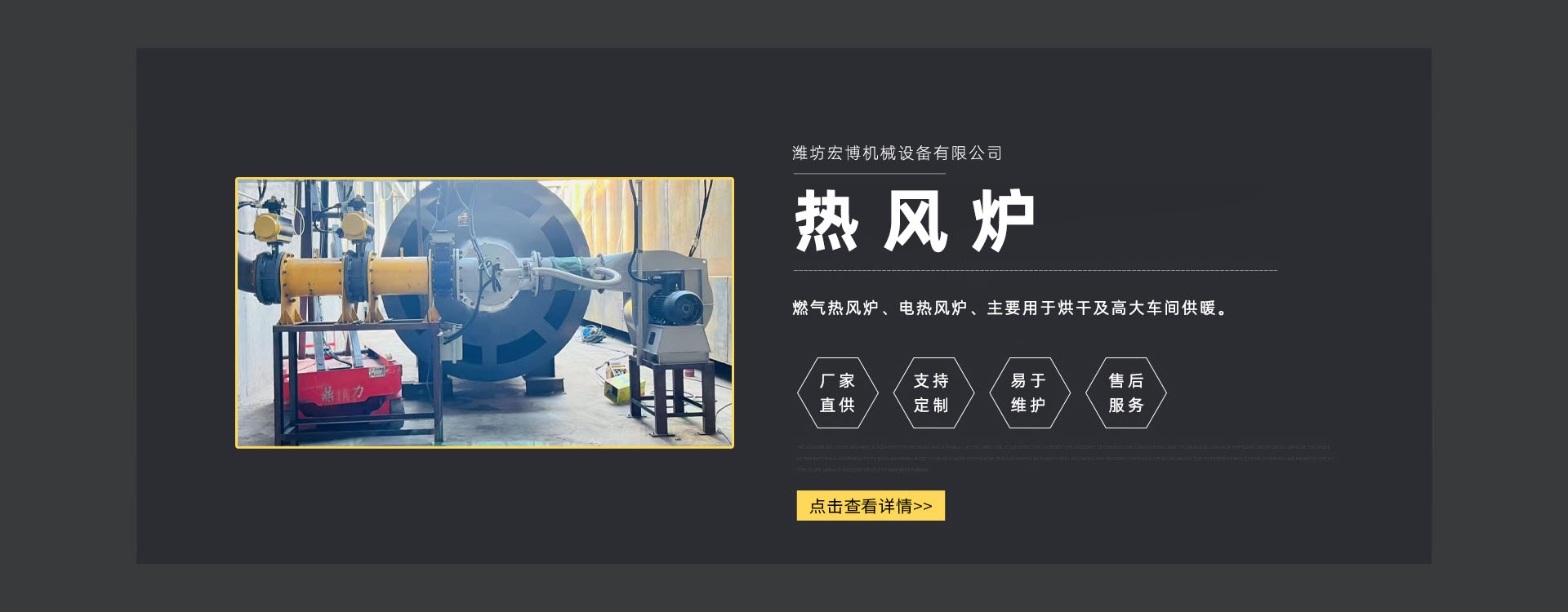 濰坊宏博機(jī)械設(shè)備有限公司是從事熱風(fēng)爐、烘干設(shè)備、供暖設(shè)備的研發(fā)(fā)、設(shè)計(jì)、制造和服務(wù)于一體的實(shí)體企業(yè)(yè)。長(zhǎng)期以來,企業(yè)(yè)以市場(chǎng)的發(fā)(fā)展和客戶的需求為導(dǎo)向,集多年的生產(chǎn)技術(shù)與經(jīng)(jīng)驗(yàn)為一體,不斷開發(fā)(fā)和優(yōu)(yōu)良產(chǎn)品。